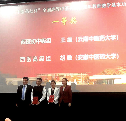 参赛前教务处、教师发展中心及基础医学院、针灸推拿康复学院、临床医学院均对选手进行了精心指导,邀请全国知名专家、相关学科教学名师修改参赛教学设计、辅导现场教学和知识问答环节,真正实现以赛促教,使参赛教师均获得质的提升,通过教学设计、教学研究论文、现场教学演示、现场教学问答四个环节的激烈角逐,最终基础医学院王维老师获得西医初中级组一等奖及教学设计单项奖,实现了我校教师参加全国大赛一等奖零的突破;针灸推拿学院张吉老师获得中医临床初中机组三等奖,吴施国、冯妮、杨丽娟、张粲老师获得优秀奖,取得良好成绩。与此同时,教育部高等学校中医类专业教学指导委员会2019年度工作会议也成功举办,熊磊校长出席会议及颁奖典礼,并作为嘉宾为获奖选手颁奖。