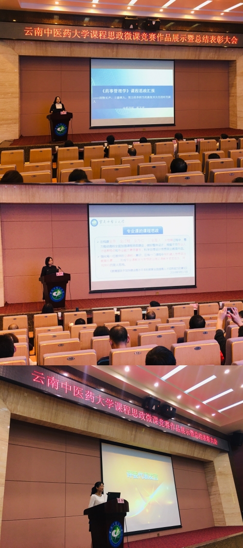 会议安排了优秀课程思政作品展播,一等奖获奖代表中药学院教师张文平、王妍与大家分享了课程思政设计思路,并特邀本次竞赛评委代表、国家教学竞赛一等奖、云南省教学竞赛特等奖获得者、昆明医科大学陈静教授现场点评。
